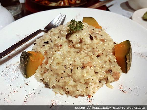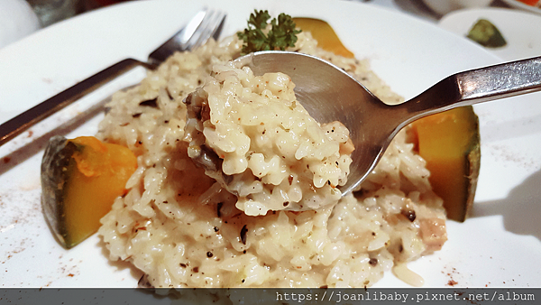 因為是燉飯,所以松露香氣完全入味在米粒之中,還有細碎蔬食擺佈其中~口味相當濃郁;