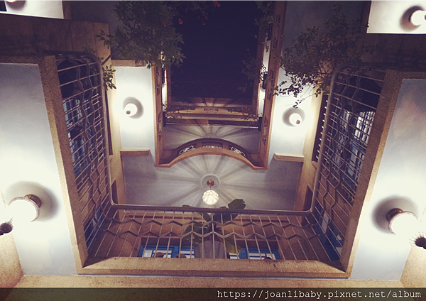 仰望ㄇ字型屋簷的視野,分不清是月光灑下來還是燈光照映,