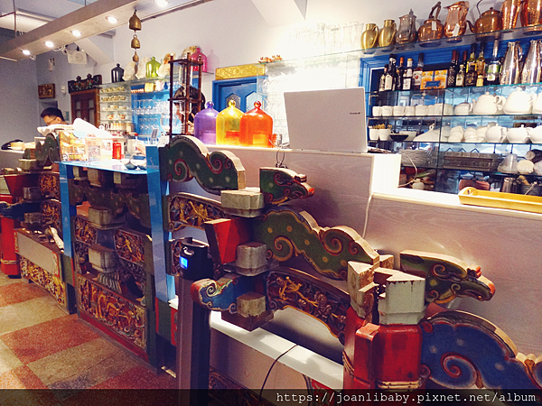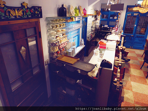 一樓的櫃檯與飲料吧檯,復古木雕加上顯色花紋拼接設計,再搭配古色古香古董古物,
