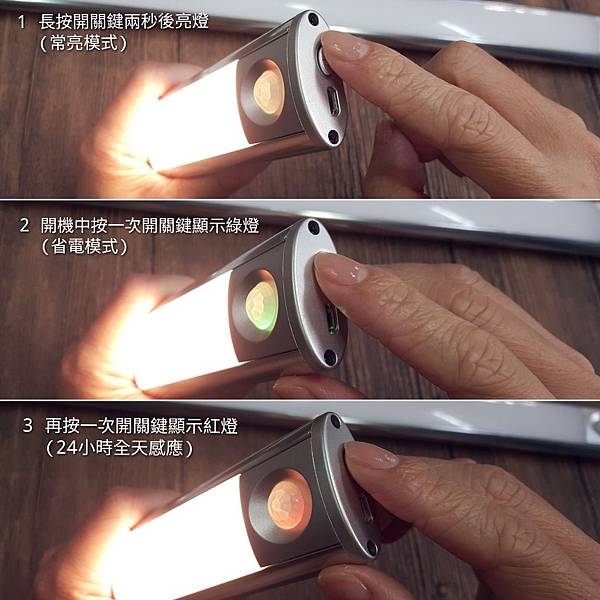 有三段式燈光調節模式:常亮模式、省電模式、24H感應模式