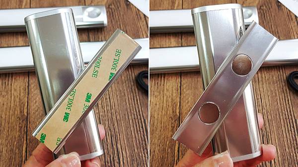 ↑↑ 磁條的背面與正面,有3M黏貼背膠的是要固定牆面的,另一面則是可以吸附感應燈的。