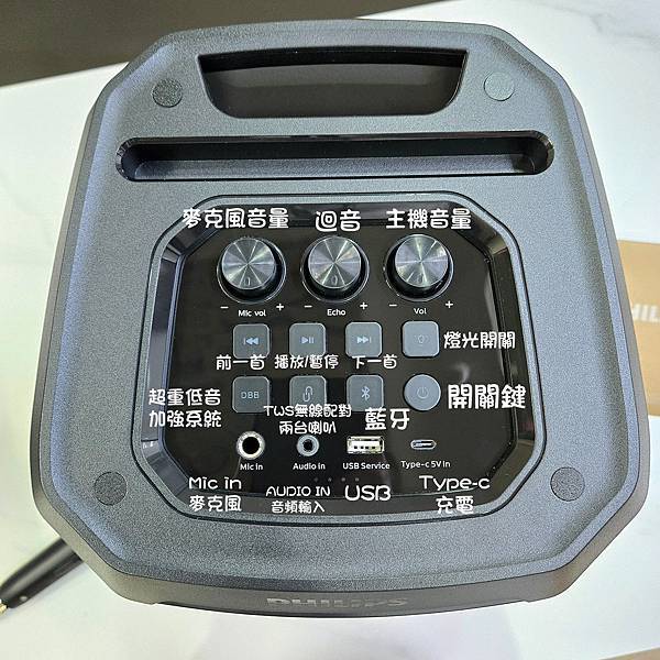 PHILIPS 藍牙30W超重低音派對喇叭-TAX2208的控制功能都集中在音箱上方💛