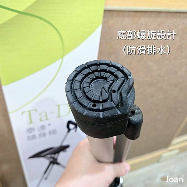 『泰達隨身椅』有三支強而有力的底腳做支撐,設計防滑斜面底墊+螺旋底面可防滑兼顧排水