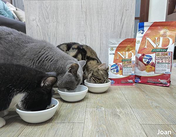 三喵已經排排站等待吃了!這次嚐鮮的口味是:天然南瓜無穀寵糧 全齡貓(鵪鶉石榴)